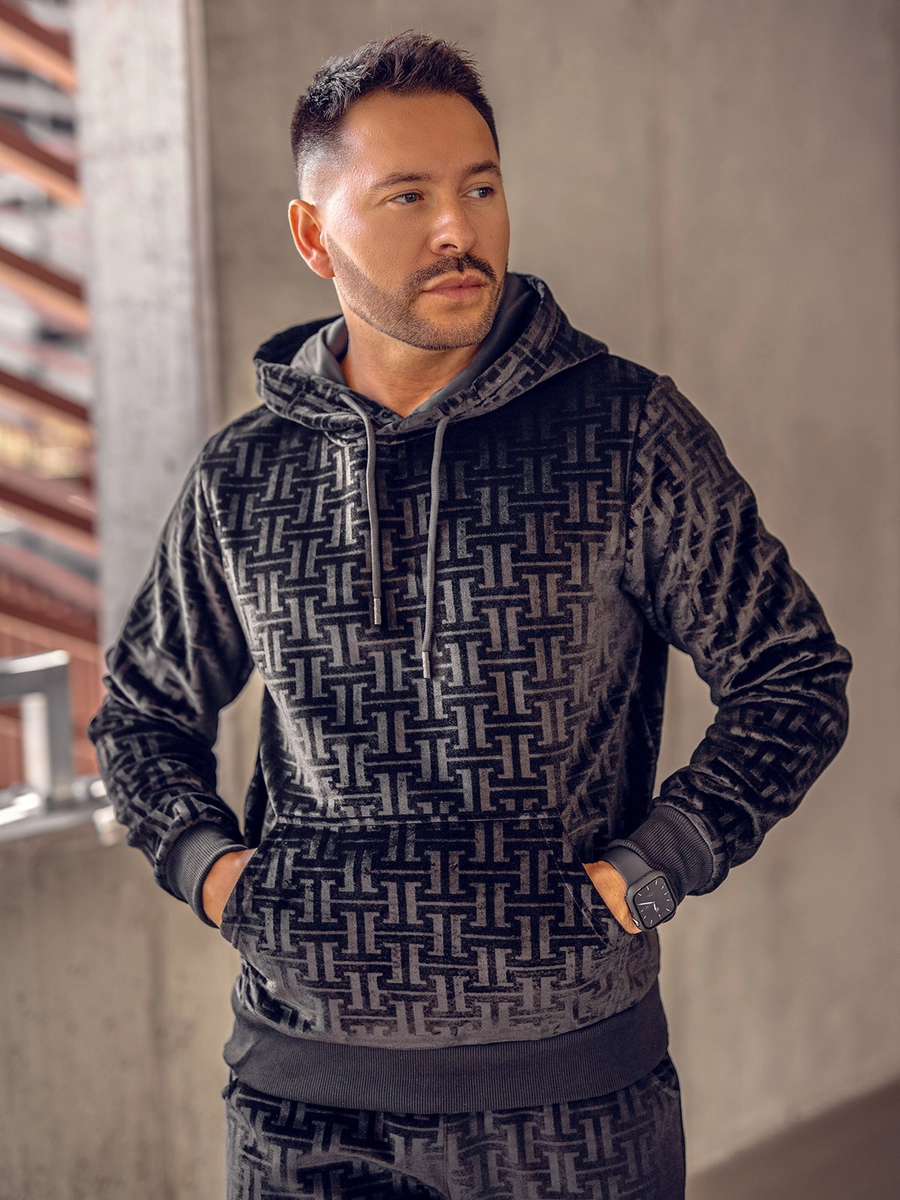 Måste ha svart träningsoverall i velour för män med huva 3A81B från Bolf-kollektionen. Tillverkad av mjuk velour, förtrollar den med sin elegans och ger samtidigt komfort. Den klassiska färgen gör den tidlös, vilket gör träningsoverallen lämplig för många olika tillfällen – både för vardagsaktiviteter och mer avslappnade utgångar. Träningsoverallen har en huva som ger den en sportig karaktär och ger skydd mot frost och regn. Elastiska muddar på ärmar och byxor säkerställer en perfekt passform, och fickor ger förvaring för småsaker. Bär den med en sportjacka.