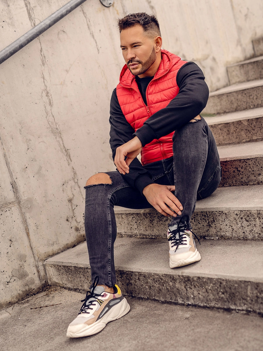 Fantastisk röd quiltad huva för män LY36A från Bolf-kollektionen. Den finns i fem olika färger, vilket ger dig möjligheten att skapa din egen drömstil. Den quiltade västen stängs med en dragkedja. En ståkrage som är fäst i huvan skyddar dig mot kyla och vind. Västen har två praktiska ytterfickor med dragkedjor där du tryggt kan förvara din telefon, plånbok och andra saker. Nertill, på huvan och i armålen finns en ribbning, vilket gör att den passar de flesta kroppsformer. Tillverkad med tanke på, bland andra, människor som gillar att spendera tid utomhus. Passar väldigt bra på promenaden eller joggingrundan. Genom att kombinera västen med en långärmad top och jeans, skapar du en casual outfit för dagen inne i stan eller när du ska ut med vännerna. Den passar också perfekt med en sweatshirt och cargobyxor.