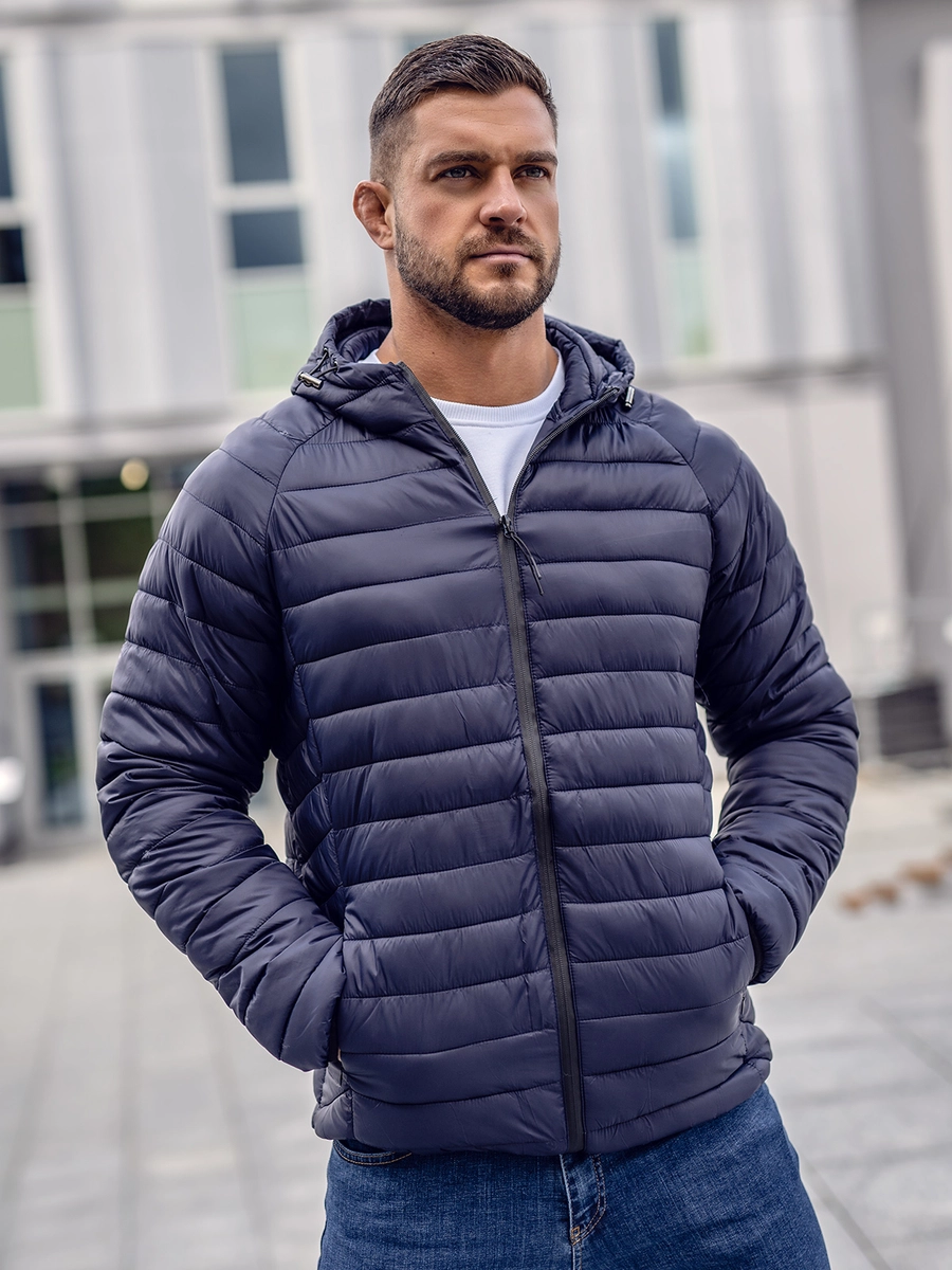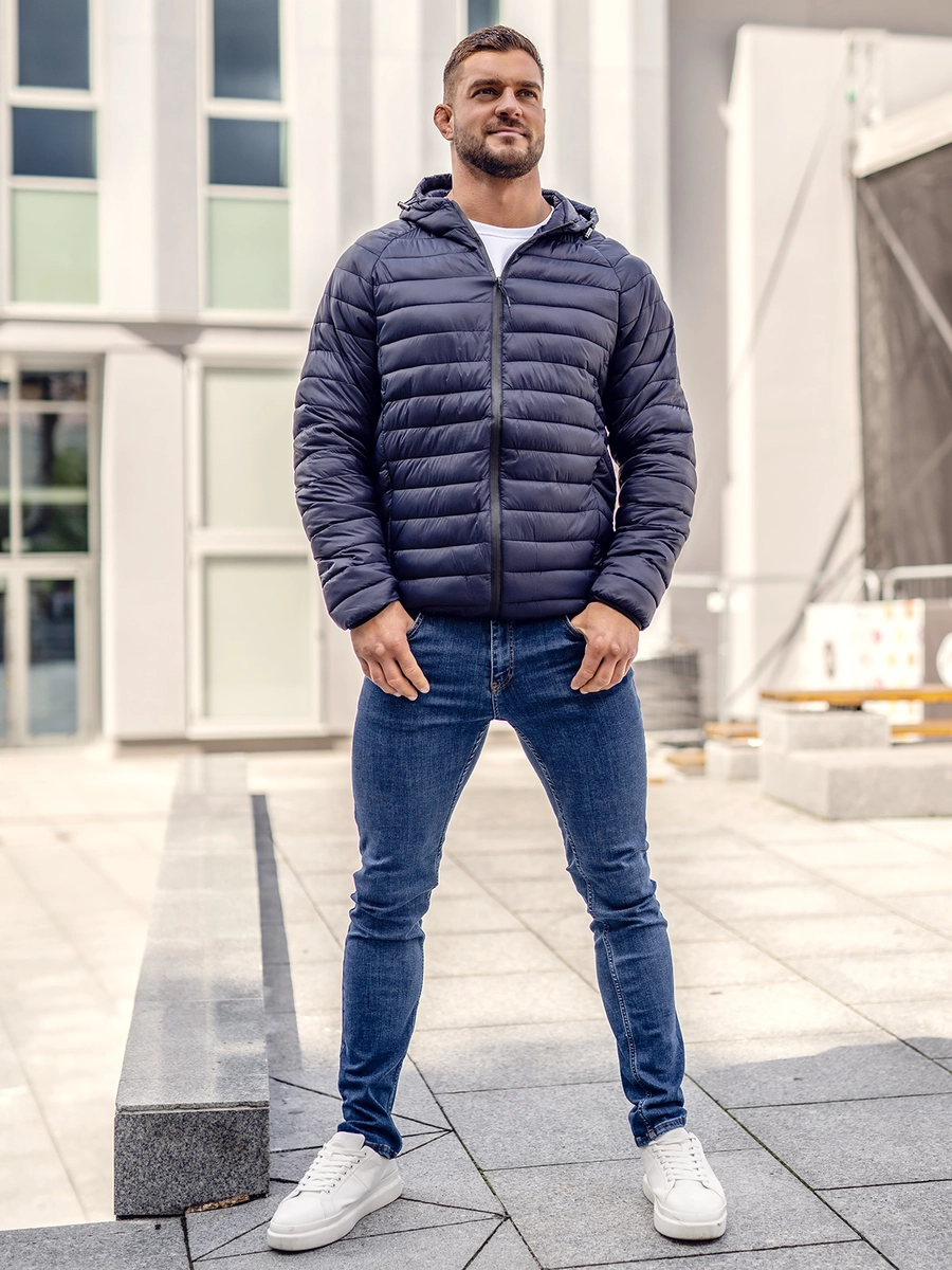 Fantastisk marinblå lätt quiltad herrjacka 13021A från Bolf-kollektionen. En bekväm och praktisk jacka är ett måste i alla aktiva mäns garderober. Du kan använda den när du tränar eller tar en promenad. Den är utrustad med blixtlås. Den har en justerbar, ej avtagbar huva som skyddar skönt mot kyla och regn. En praktisk detalj är två fickor med dragkedjor. Elastik mudd vid ärmslut och nertill. Jackan är tillverkad av 100% nylon, så den är stretchig. Passar perfekt med jeans eller joggers.