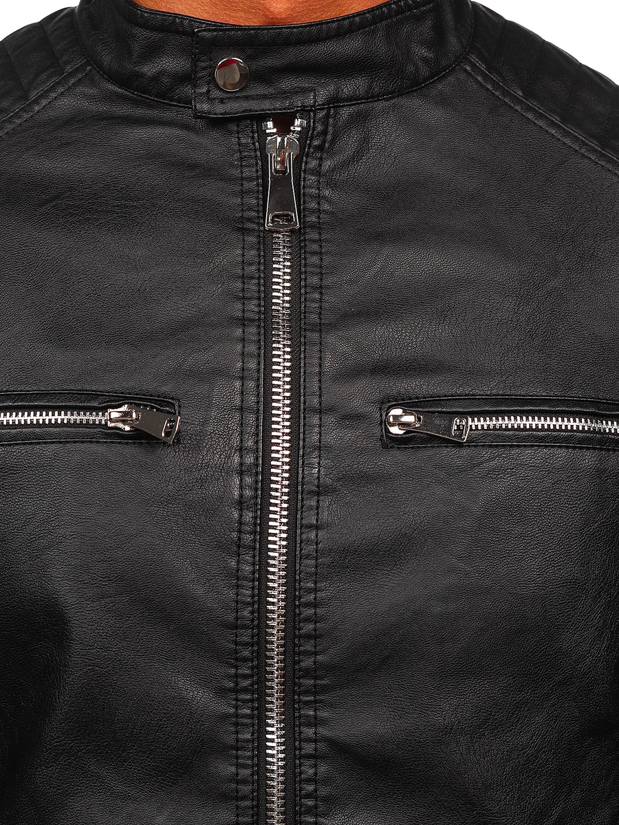 Bekväm skinnjacka för män 11Z8066 från Bolf-kollektionen. Tillverkad av högkvalitativa material, den är bekväm att bära och ger rörelsefrihet. Den har en ståkrage som fästs med tryckknappar, vilket perfekt skyddar mot kyla och vind. Ytterfickorna är rymliga och knäpps med dragkedja. Jackan är lätt att kombinera med andra klädesplagg. Den kommer att passa både till vardags och att gå ut styling. Kombinera den med en tröja med pikétröja och chinos.