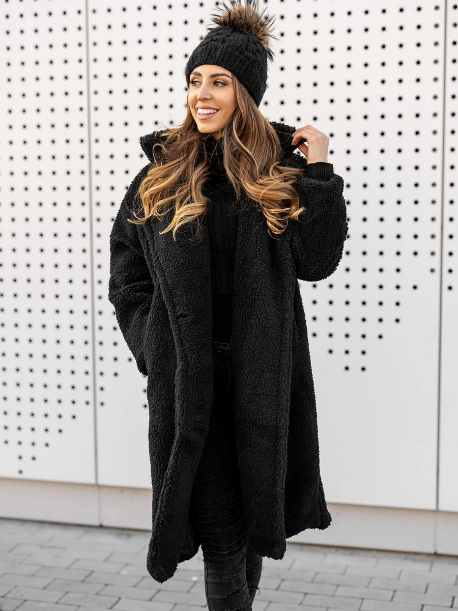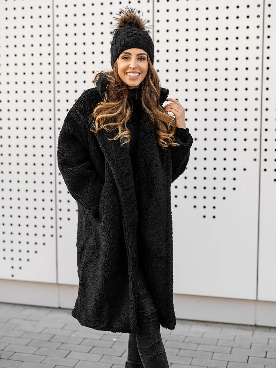 Vacker svart varm långlinad vinterkappa för kvinnor AN105B från Bolf-kollektionen. Kappan är fodrad och stängs med knappar. Den har två ytterfickor utan stängning där du kan förvara din telefon, plånbok, nycklar eller andra nödvändiga saker. Karakteristiska drag är att den har enkla snitt, är av oversize-modell och har snygga slag på kragen. Den är tillverkad av 100% polyester, vilket gör den väldigt bekväm och flexibel till olika kroppsformer. En vinterkappa passar utmärkt för alla tillfällen under lite kallare dagar. Den passar perfekt med en lång klänning eller jeans och en klassisk tröja.