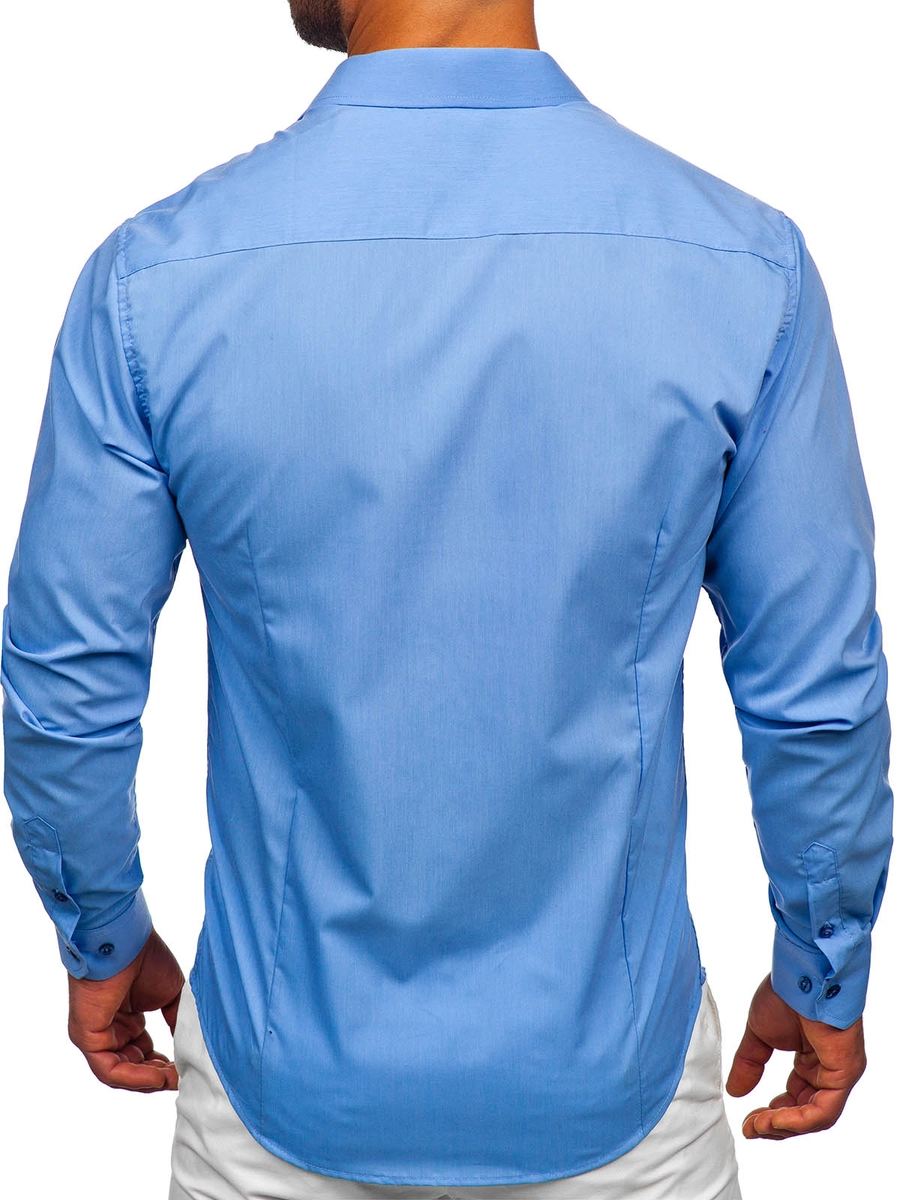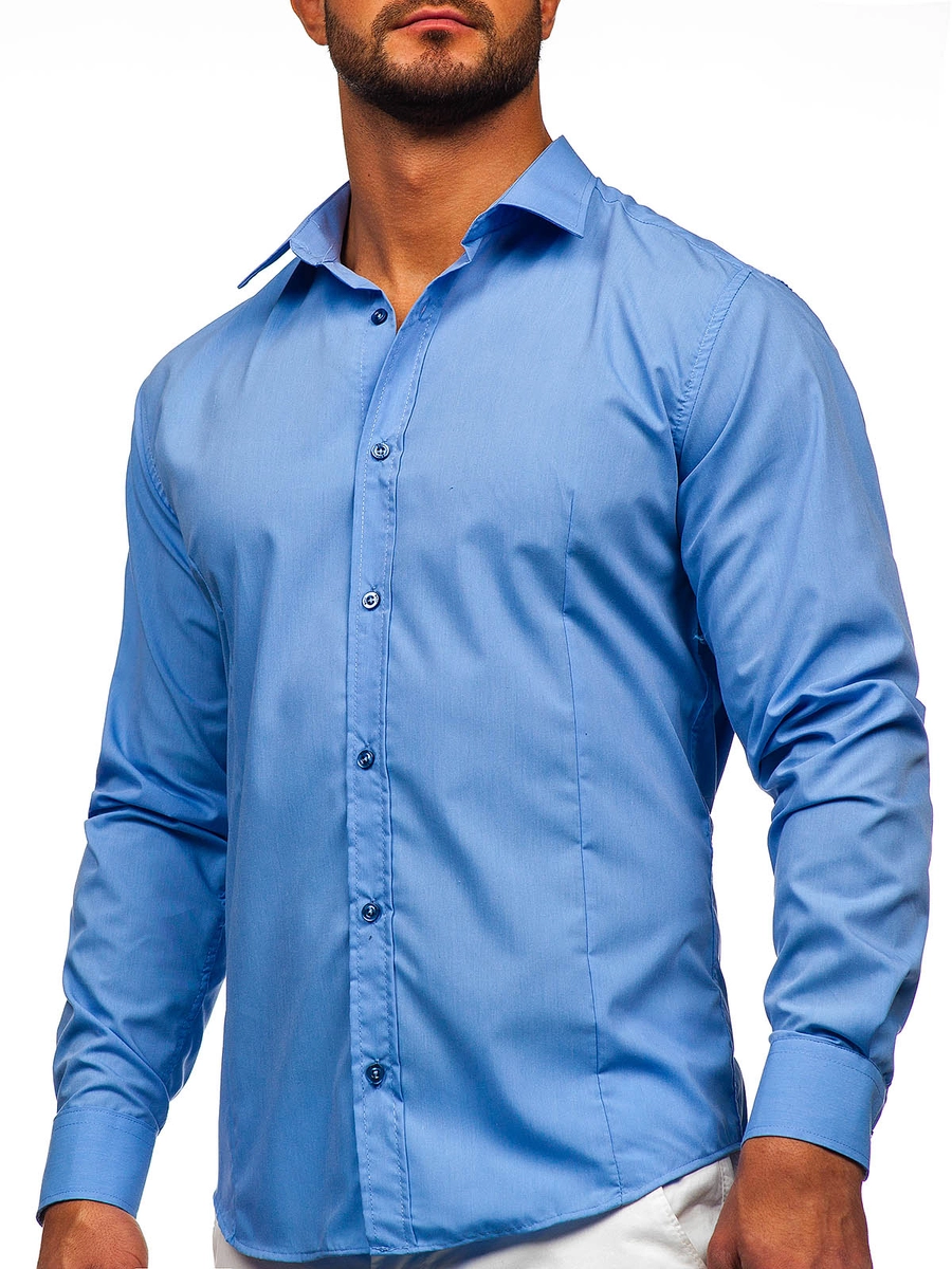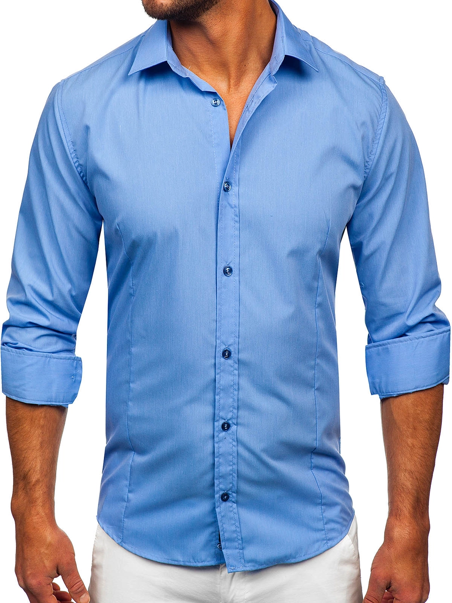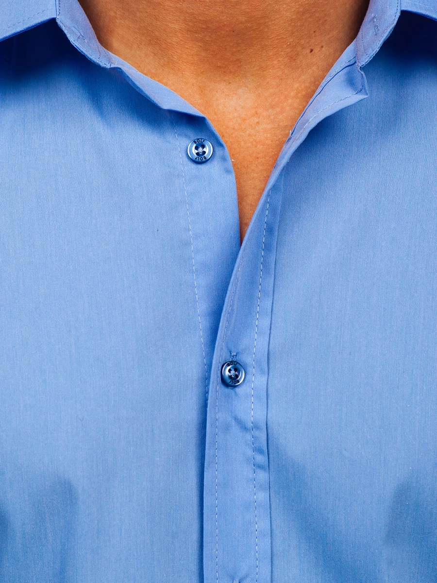 Elegant blå långärmad herrskjorta 1703 från Bolf-kollektionen. Den här modellen finns i flera olika färger. Enfärgade herrskjortor rekommenderas till de som gillar minimalism och klassisk elegans i modet. Den är bekväm och har bra passform. Defenitivt ett måste i den medvetna affärsmannens garderob. Designen är rak och passar till olika stilar. Skjortan är av slim fit-modell, har knappar och är praktiskt rundad nertill. Ärmarns avslutas med en bred, justerbar manschett som stängs med en knapp. Den har en klassisk krage med korta slag.