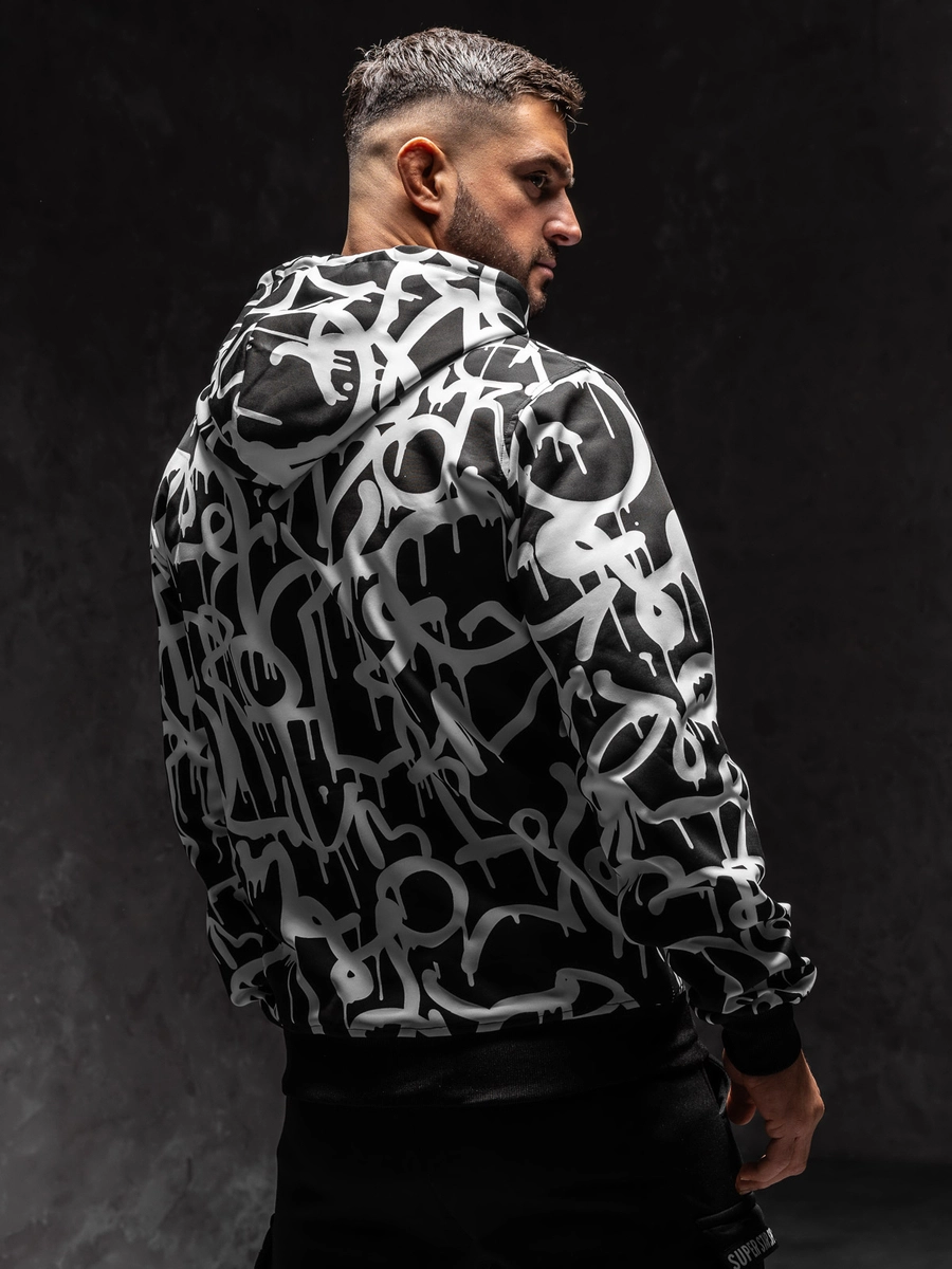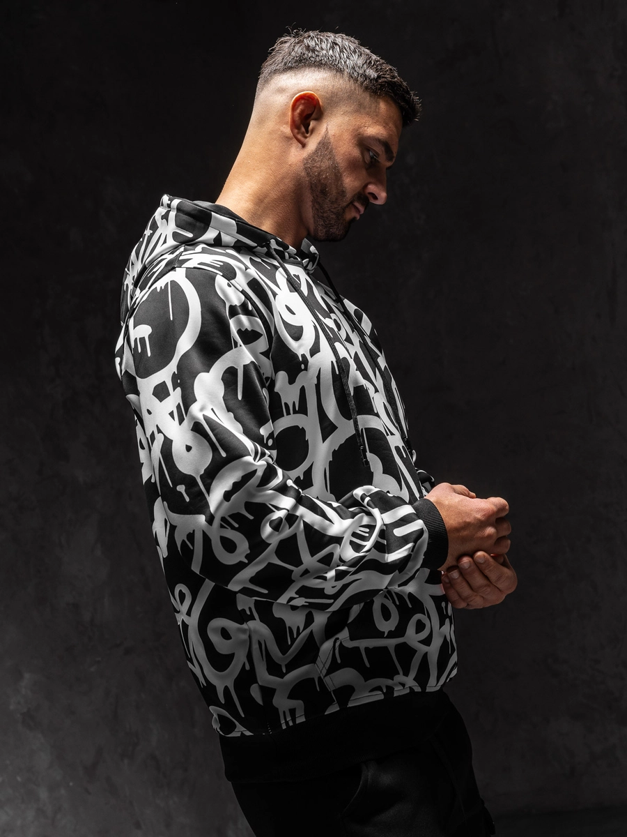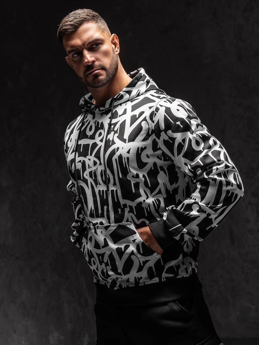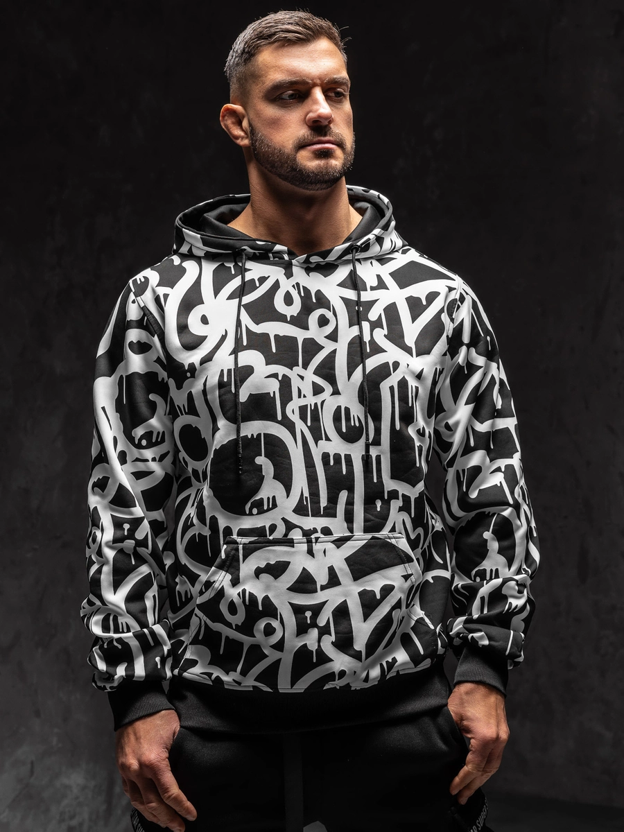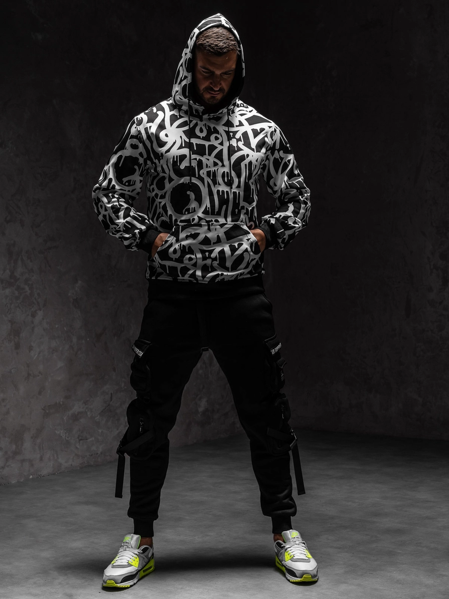 Är du en älskare av sweatshirts och intressanta mönster? Då är den svarta och vita herrtröjan 8B1152A1 från Bolf-kollektionen något för dig! Tröjans klassiska snitt, justerbar huva och en rymlig känguruficka garanterar full komfort när du bär den. Spår längst ner på tröjan och ärmarna gör att tröjan passar bra till figuren. Den är gjord av behagligt att ta på och flexibelt material. Tack vare den presenterade modellen kommer du att sticka ut även när du vilar hemma. Tröjan kommer att se fantastisk ut med både träningsbyxor och jeans.