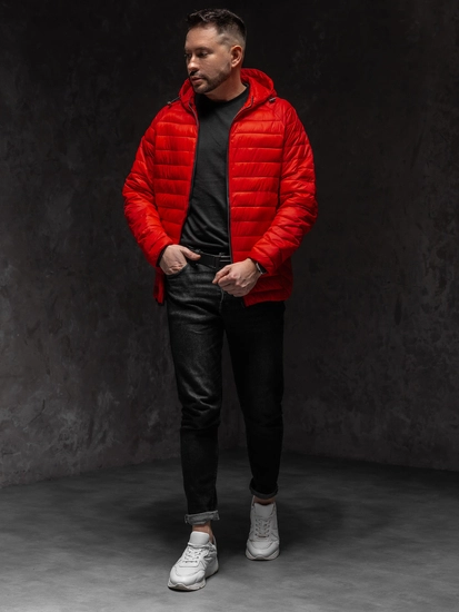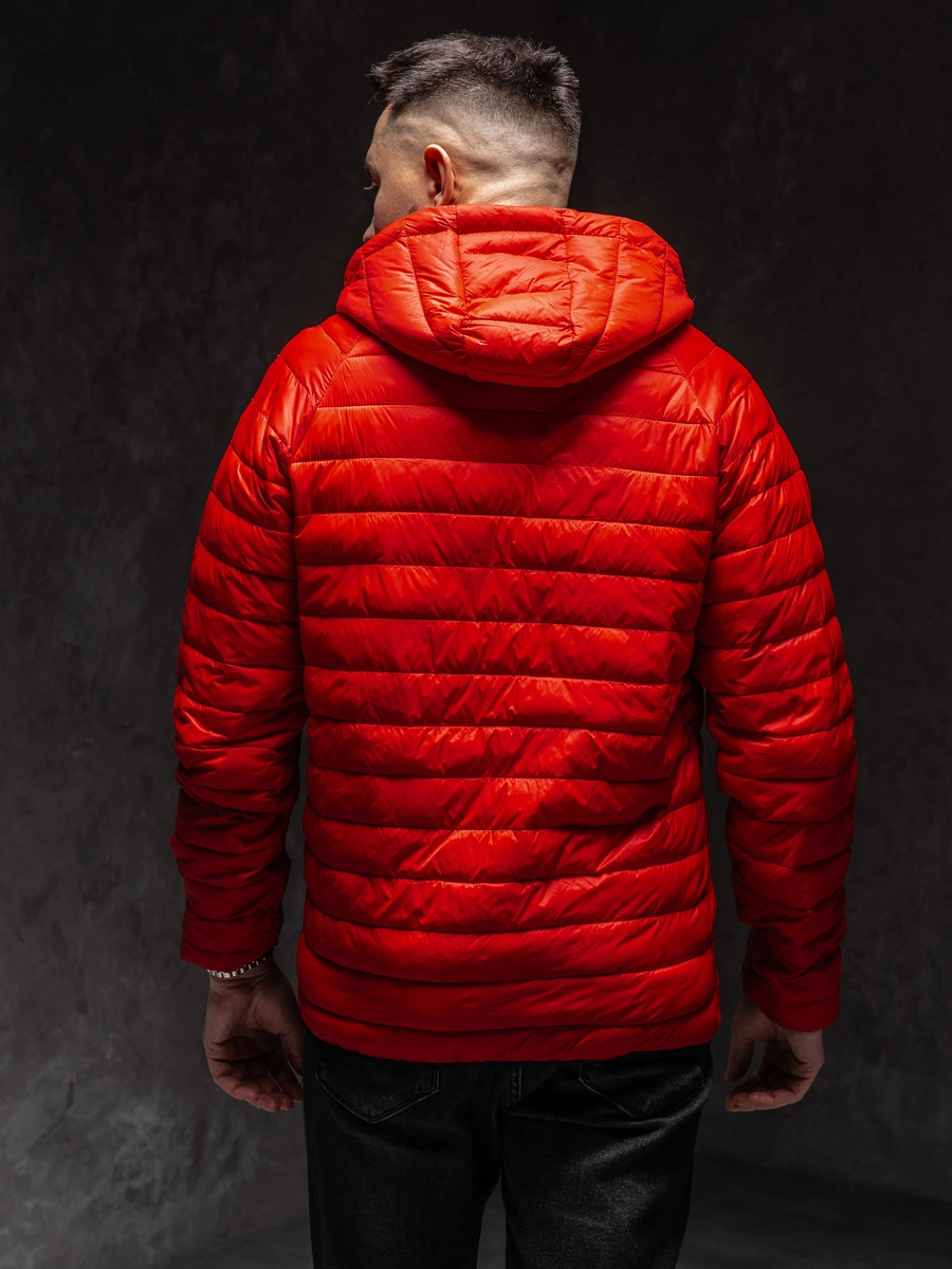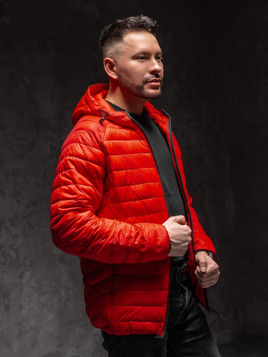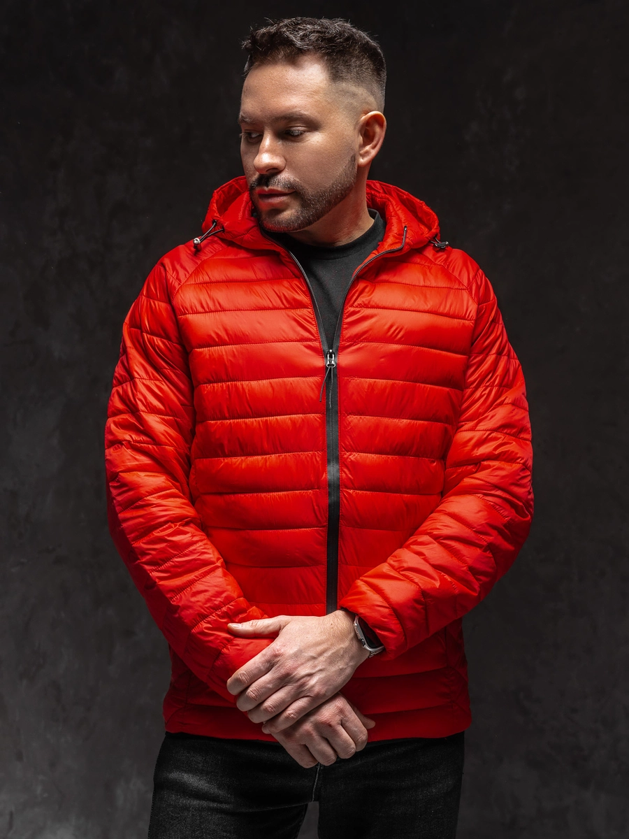 Fantastisk röd lätt quiltad herrjacka 13021A1 från Bolf-kollektionen. En bekväm och praktisk jacka är ett måste i alla aktiva mäns garderober. Du kan använda den när du tränar eller tar en promenad. Den är utrustad med blixtlås. Den har en justerbar, ej avtagbar huva som skyddar skönt mot kyla och regn. En praktisk detalj är två fickor med dragkedjor. Elastik mudd vid ärmslut och nertill. Jackan är tillverkad av 100% nylon, så den är stretchig. Passar perfekt med jeans eller joggers.