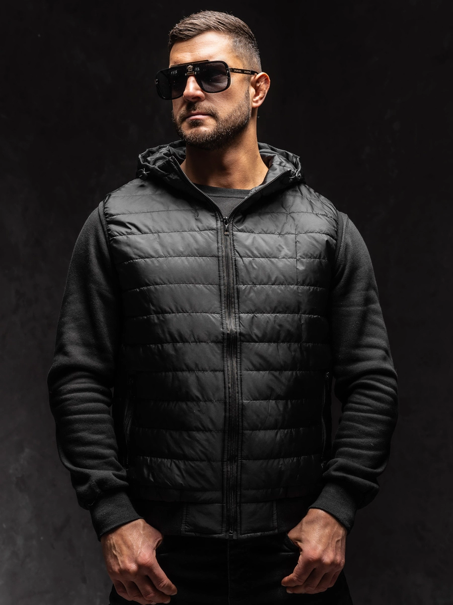 Snygg svart quiltad herrväst med huva MY88A1 från Bolfs kollektion. Den knäpps med en bekväm dragkedja och har en ståkrage. Den ej avtagbara huvan skyddar perfekt mot regn och vind. Ett användbart element är två yttre fickor med dragkedjor. Ärmhålen är avslutade med en elastisk fåll och nederkanten är avslutad med en kant. Produkten kommer att hitta sin plats i garderoben för varje man som värdesätter sportstil. Du kan bära västen för en promenad, joggingtur eller helg. Den är tillverkad av 100% polyester. Den kommer att passa bra med en långärmad topp, jeans eller träningsbyxor.