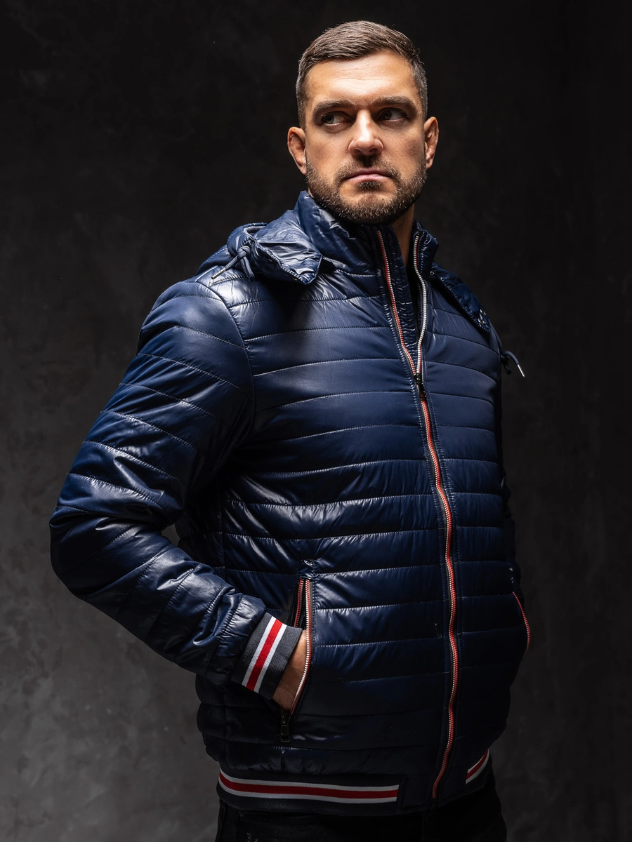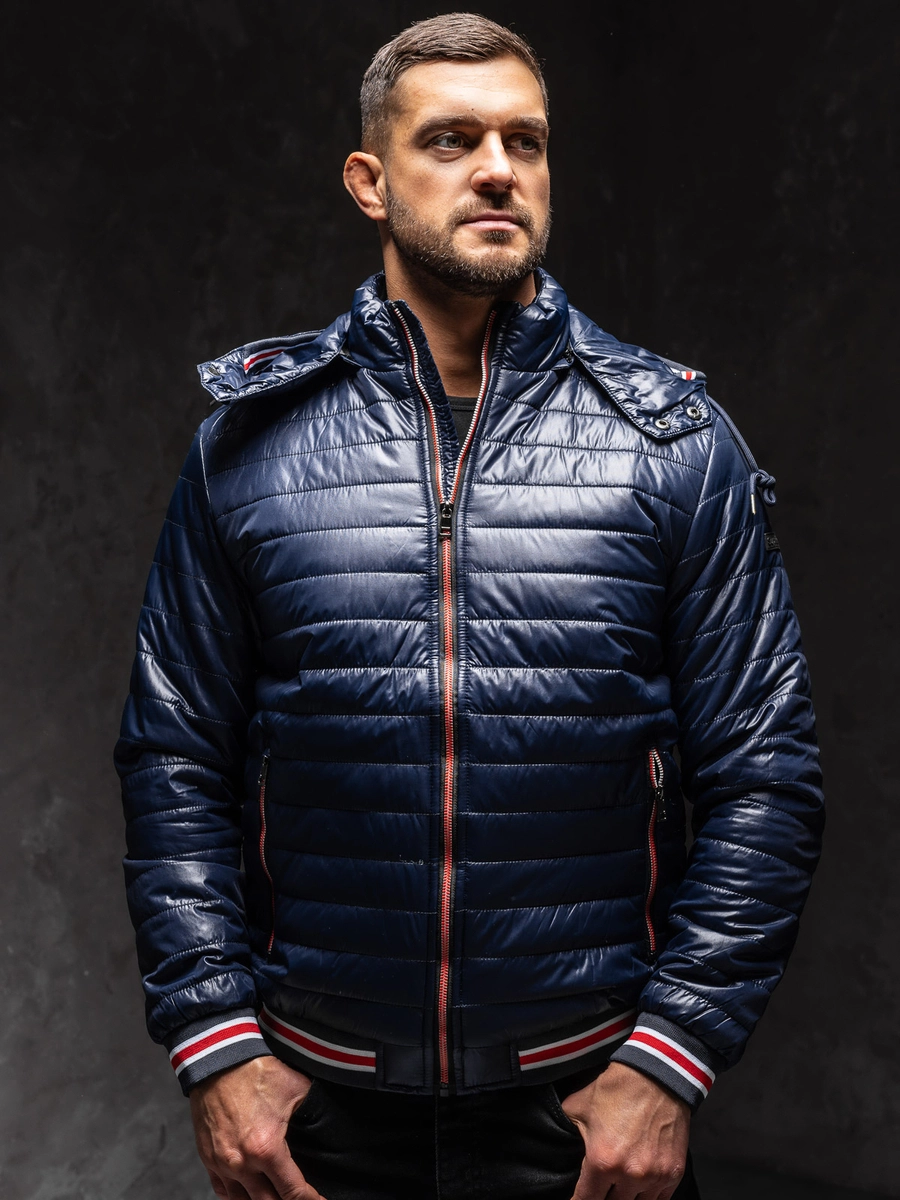 Iögonfallande marinblå lätt quiltad herrjacka 6191A1 från Bolf-kollektionen. Hela jackan är vadderad. Det finns en dragkedja och en stå-upp krage. Den är utrustad med ribbade ärmar, huva och nertill. Två utvändiga fickor med dragkedja. Justerbar och avtagbar huva.