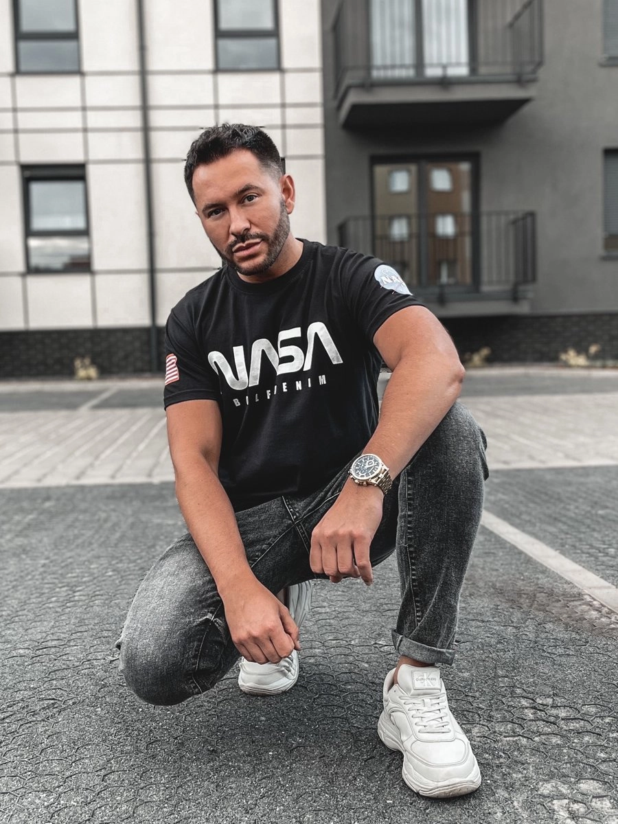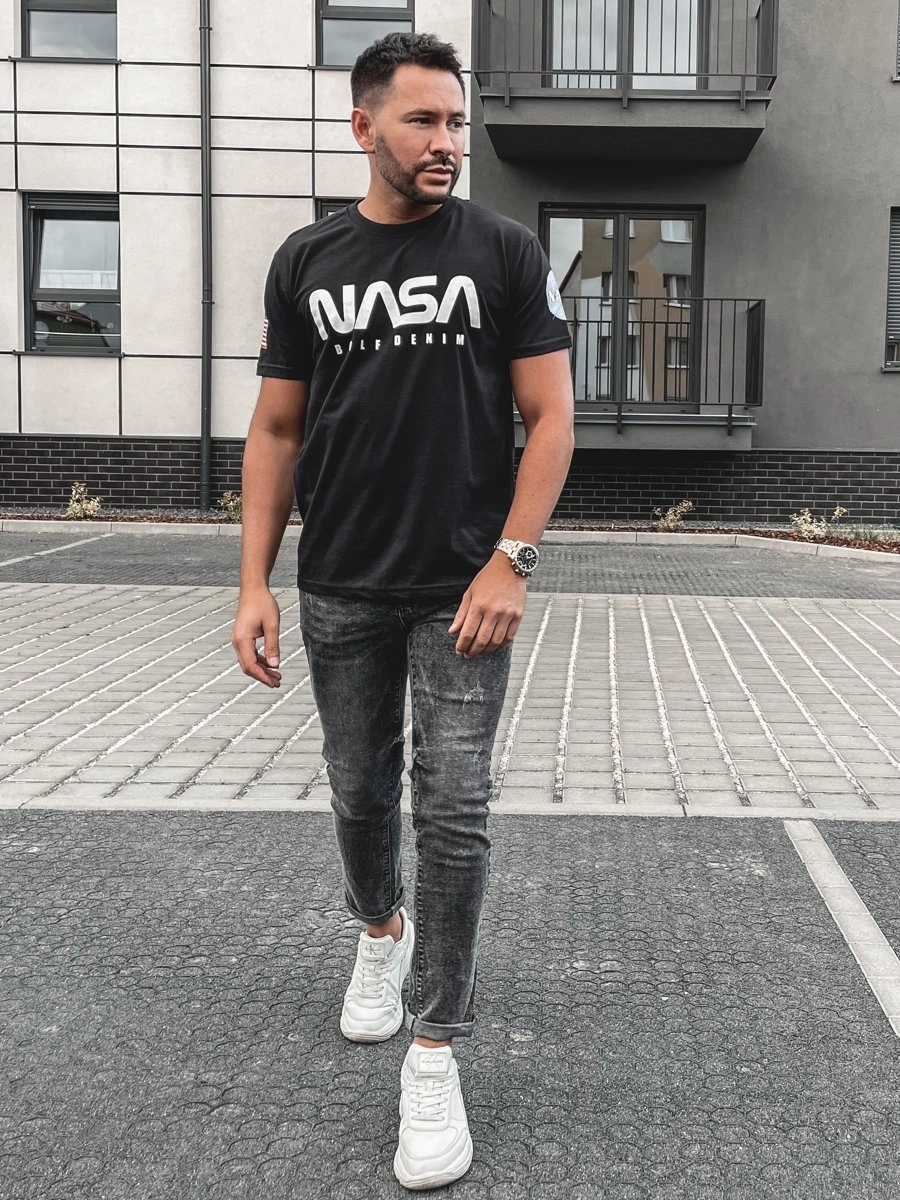 Iögonfallande svart bomulls T-shirt i med tryck 14401A2 från Bolfs kollektion. Den här modellen finns i två färger och har snyggt tryck som adderar karaktär åt din outfit. Den har en rund halsringning och är tillverkad av 100% bomull. Den här T-shirten är tillverkad av ett väldigt fint och mjukt material av högsta kvalitet. Den passar utmärkt till din sommaroutfit ihop med shorts och en sweatshirt.