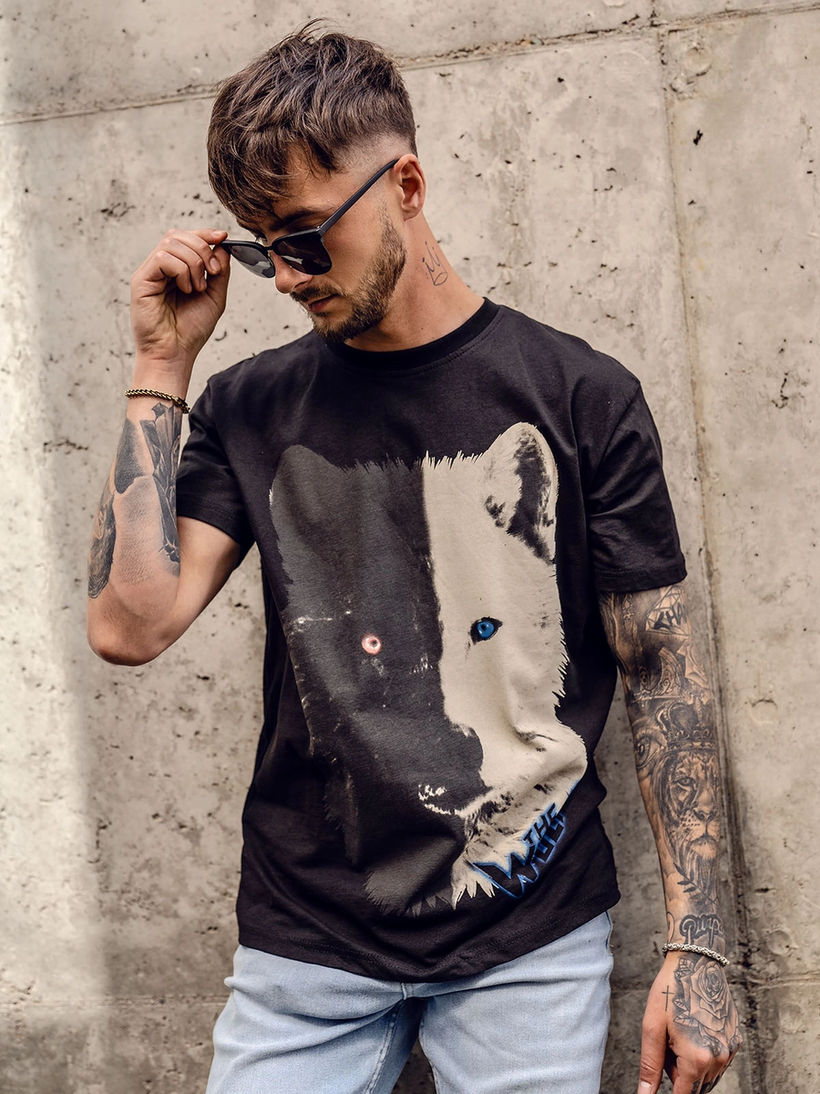 Snygg svart herr bomulls T-shirt med tryck 14800A från Bolf kollektionen. Den har en klassisk och elegant rund halsringning som gör den lätt att ta på sig över huvudet. T-shirten är flexibel, tack vare vilken den passar perfekt till varje figur. T-shirtens ärmar är lösa, du kommer att känna dig bekväm i den. Baksidan av produkten är slät.