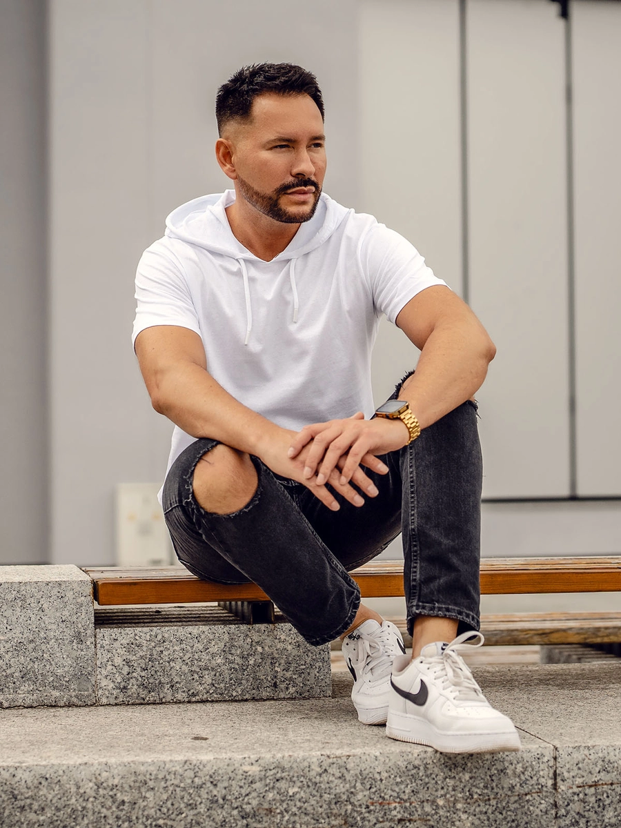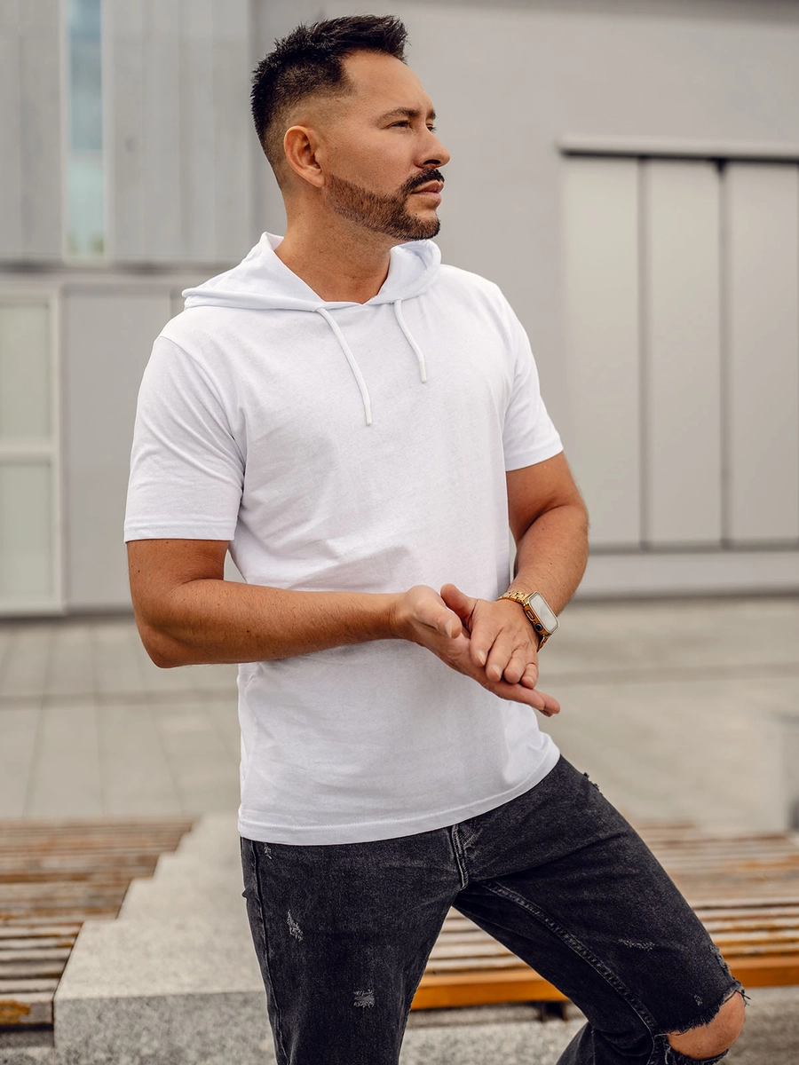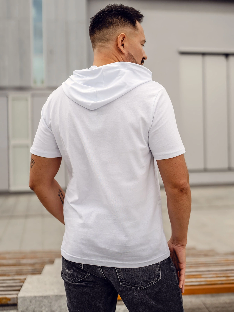 Cool vit herr basic bomulls T-shirt med huva 14513 från Bolf kollektionen. Denna unika T-shirt är utrustad med en modern och praktisk huva. Den kommer i fyra färgvarianter, tack vare vilka du kan matcha den till vilken stil som helst. En basic t-shirt kommer att vara perfekt för nästan alla tillfällen. Den här är gjord av 100% bomull, vilket gör den till en extremt bekväm och åtråvärd produkt. Det är ett måste i din garderob! Du kan kombinera det med våra shorts. Den är också perfekt för styling med våra joggingbyxor och en läderjacka.