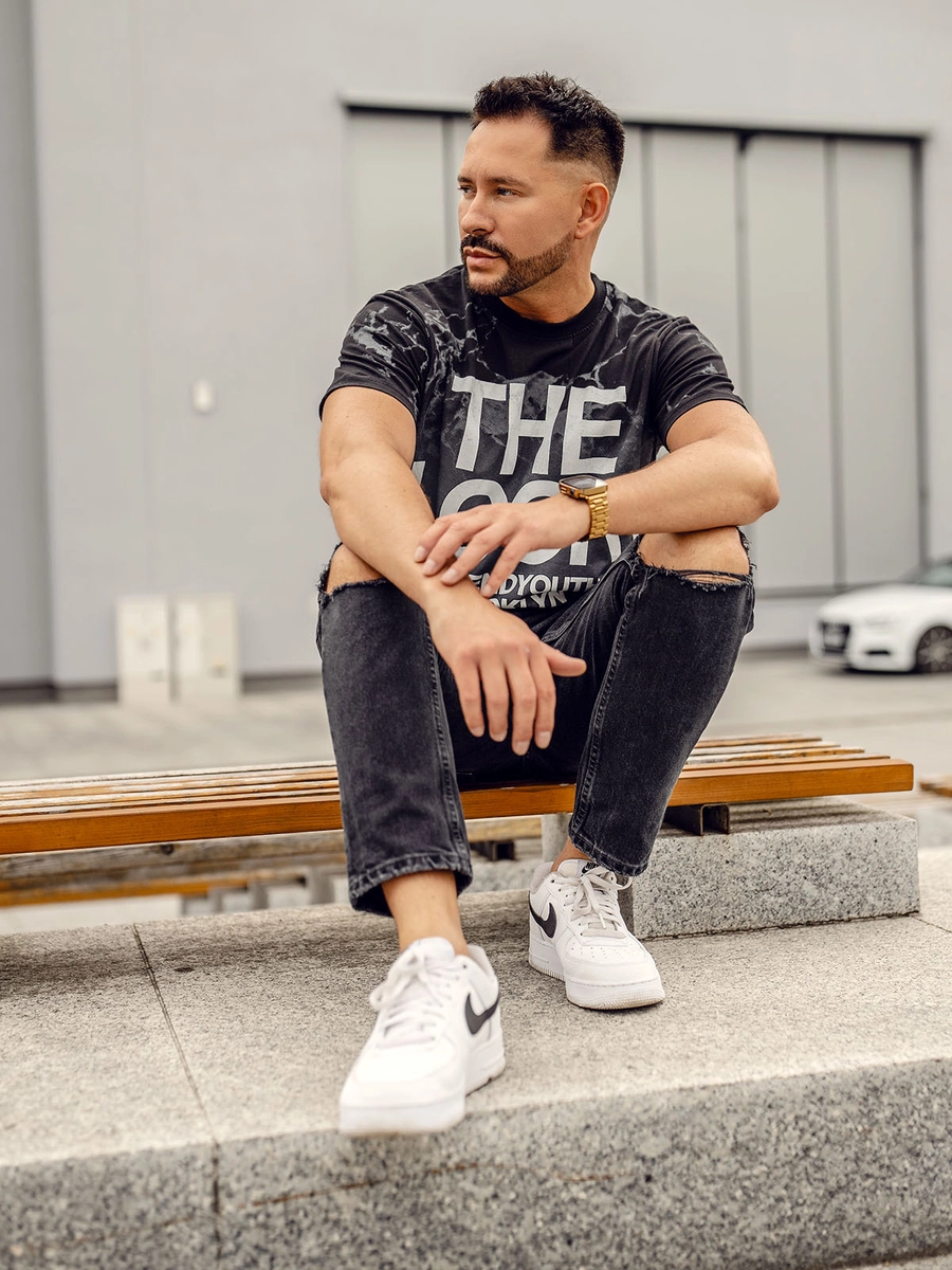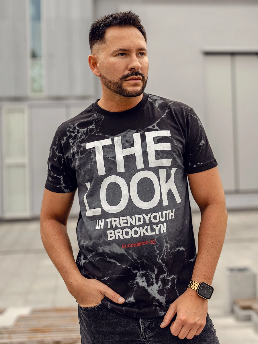 Universal svart bomullstryckt herr-T-shirt med rund halsringning 627A-1 från Bolf-kollektionen. Tack vare originaltrycket kommer skjortan att få dig att sticka ut från mängden och kommer att vara en effektiv variant för alla stylingar. Tack vare uppmärksamhet på detaljer och gjord av material av högsta kvalitet är t-shirten extremt bekväm. En T-shirt är grunden för nästan varje fashionabel och universell stil. Bär den för ett möte med vänner, träning eller en resa till bergen. Under varmare dagar kommer den att passa perfekt med shorts och på kallare dagar, kombinera den med jeans.
