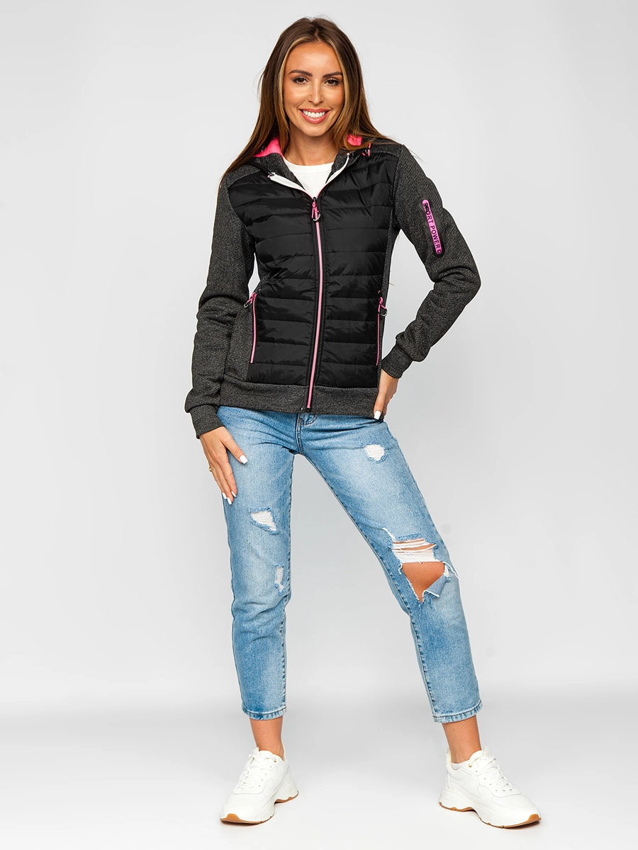 Snygg svart quiltad lättviktsjacka med huva KSW4001A1 från Bolfs kollektion. Den justerbara huvan i kombination med kragen och de ytterfickorna med dragkedja är perfekta för att skapa sportiga stilar. Kombinera den med jeans eller träningsbyxor.