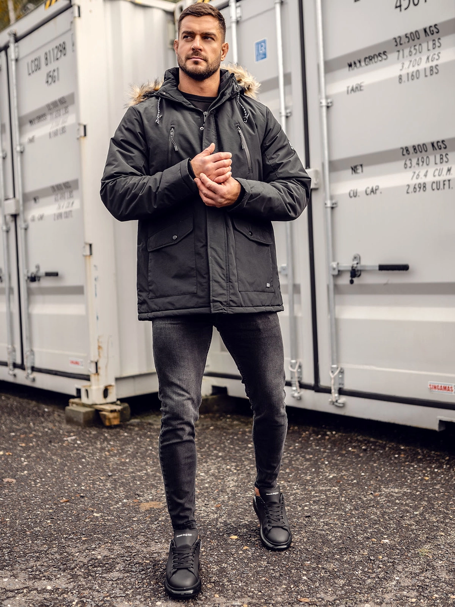 Snygg svart quiltad herrvinterparkas WX032A från Bolfs kollektion. Den har dragkedjestängning. Den har en ståkrage och en avtagbar huva, tack vare dessa skyddar den dig bra mot vind och kyla. Ett unikt, dekorativt element är den avtagbara pälsen på huvan och logotypen på ärmen. Det enkla snittet och passformen gör att alla får ett väldigt fördelaktigt utseende i den. Jackan har praktiska bröstfickor med dragkedja och ytterfickor täckta med lock som knäpps med en tryckknapp. Det finns ytterligare en ficka invändigt. Jackan är tillverkad av material av hög kvalitet, vilket gör den väldigt mjuk och bekväm. Den består av 100% polyester. Tack vare dess mångsidighet kan den lätt matchas med många olika stilar. Det kommer att skapa en perfekt kombination med jeans och en långärmad topp.