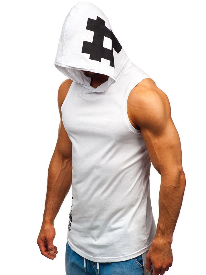 Utmärkt vitt bomullslinne med huva från Bolfs kollektion. Det är lätt, bekvämt, har ett tryck och är rundad nertill. Passar bra till en lite sportigare look tillsammans med ett par joggers, jeans eller shorts.