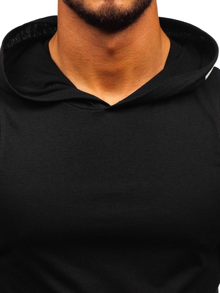 Superbt svart bomullslinne med huva från Bolf-kollektionen. Det är lätt, bekvämt, har ett tryck och är rundad nertill. Passar bra till en lite sportigare look tillsammans med ett par joggers, jeans eller shorts.