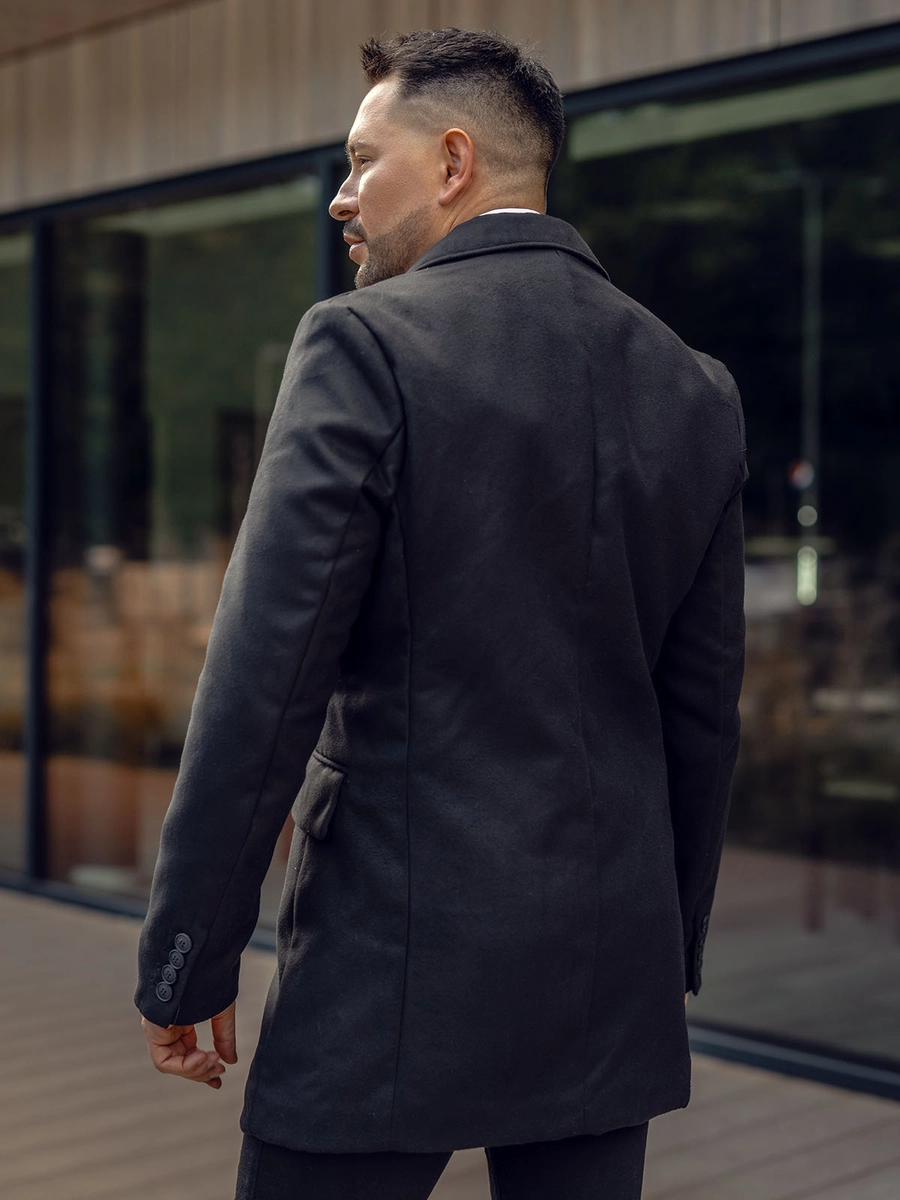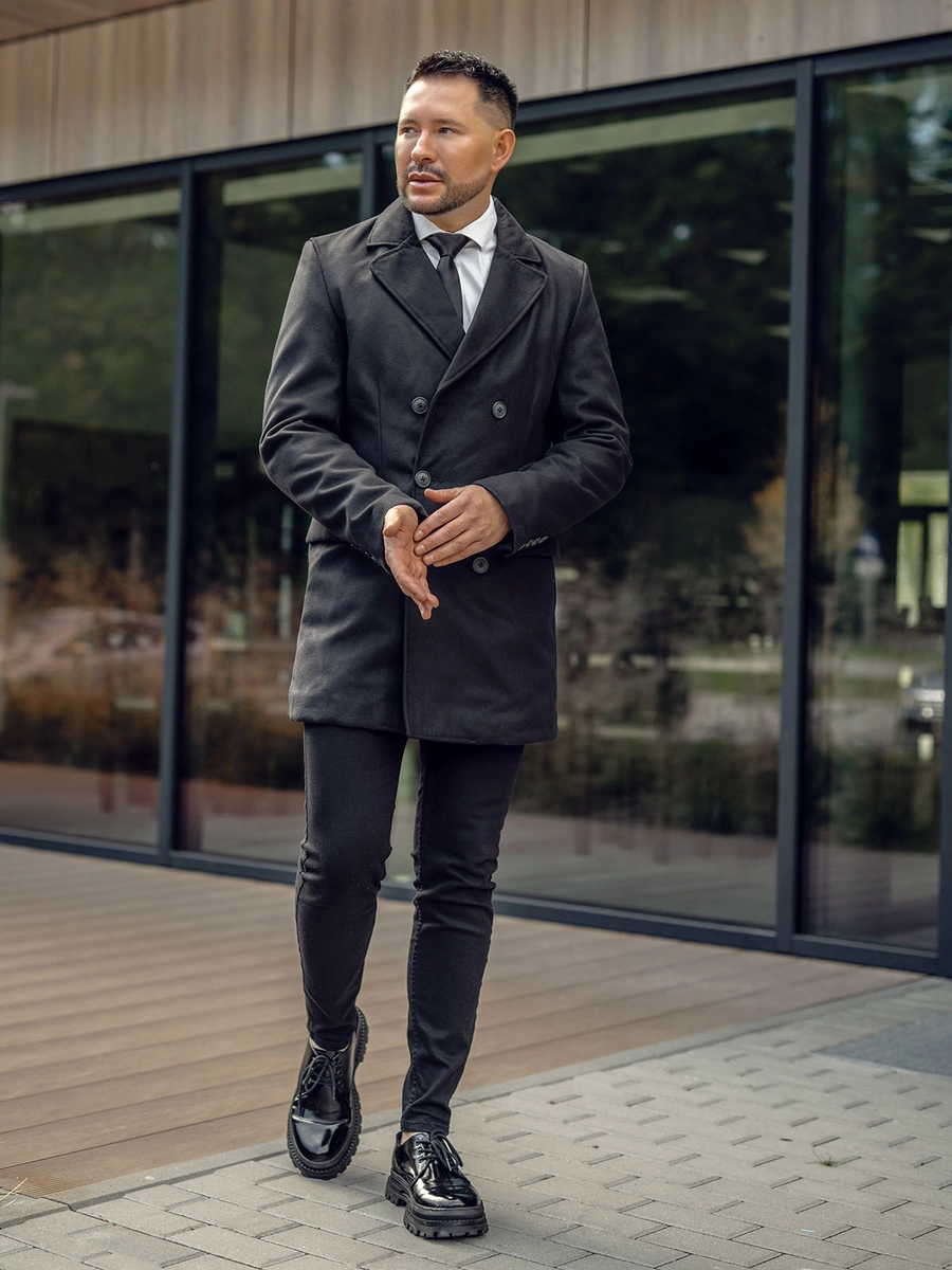 Svart dubbelbröstad herrvinterrock 79B3A-073 från Bolfs kollektion. En klassisk dubbelknäppt med knappar. Den har en stor, snygg omvänd krage. Den har två ytterfickor med lock och en innerficka där du kan förvara de mest värdefulla sakerna som exempelvis din plånbok. Dekorativa inslag är sydda knappar på ärmsluten. Rocken är tillverkad i material av hög kvalitet. Den är väldigt originell men har samtidigt en tidlös elegans. Perfekt ihop med chinos, en skjorta och en jacka, för en mer formell stil. Du kan använda den med jeans och en tröja för en passande outfit på kvällspromenaden.