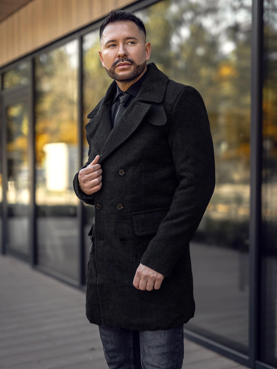 Utsökt svart varm herr vinterrock 1048A2 från Bolfs kollektion. Den har knappstängning och är dubbelbröstad. Den har två utvändiga snäppfickor med lock och en innerficka med knapp. Snygg och har bra passform. Omvänd krage. Den intensiva färgen fungerar bra i olika stylingar.