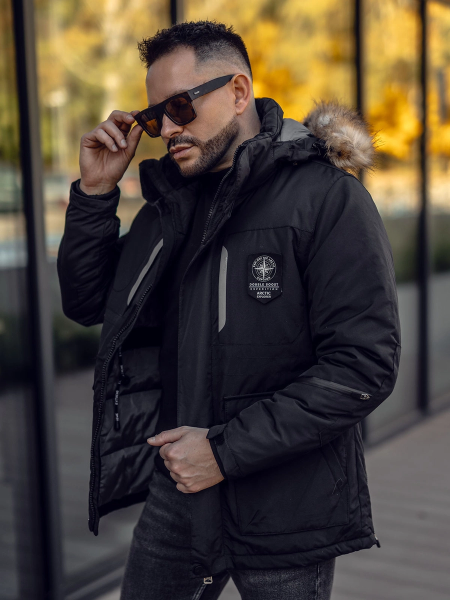 Varm och praktisk svart vinterjacka från Bolfs kollektion. Den har 6 stora fickor, en avtagbar huva och päls. Den är designad för de kalla dagarna, är justerbar i ärmsluten, har dubbel stängning och dragsko i midjan. Modellen passar bra tillsammans med en tjock tröja, jeans och boots.
