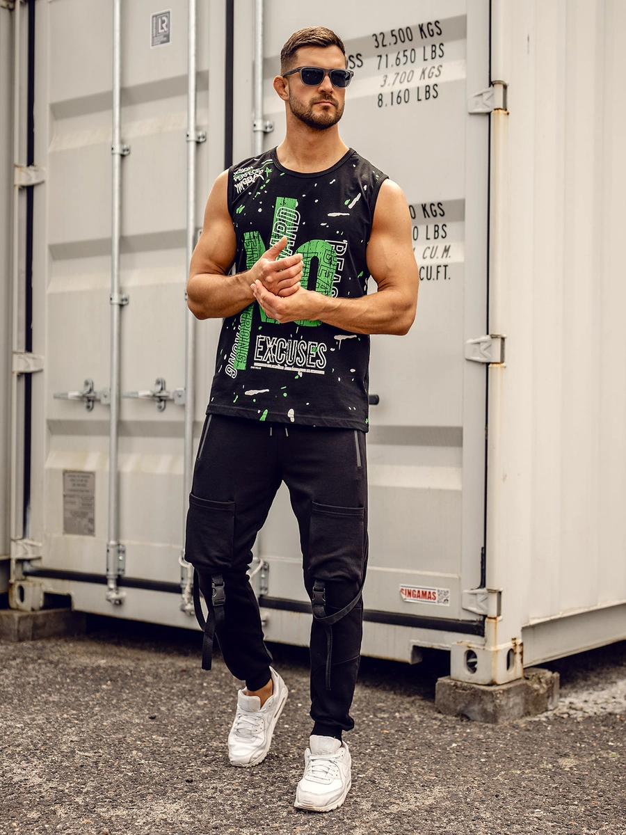 Unikt svart linne 14825A för män från Bolf-kollektionen. Linnet är tillverkat av 100% bomull. Den är mjuk och behaglig att ta på, flexibel och luftig, vilket gör den till ett idealiskt val för vår och sommar. Den har en rund halsringning och framhäver figuren perfekt. Designtrycket på framsidan ger en moderiktig karaktär och fångar blickarna. Färgen gör tröjan lätt att kombinera med andra klädesplagg. Den kommer att vara perfekt för vardagsbruk, en tur på stan, gym eller jogging. Kombinera den med shorts eller jeans.