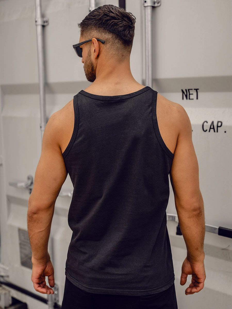 Unikt svart boxerlinne med tryck för män 143029A från Bolf-kollektionen. Tillverkad av högsta kvalitet, mjukt och luftigt material, den är perfekt för varma dagar och träning. Dess vanliga snitt anpassar sig perfekt till figuren och säkerställer rörelsefrihet. Den passar perfekt till en mängd olika stilar – både avslappnad och mer sportig. Kombinera den med en tröja med dragkedja och byxor med smal passform för en fashionabel, vardaglig look.