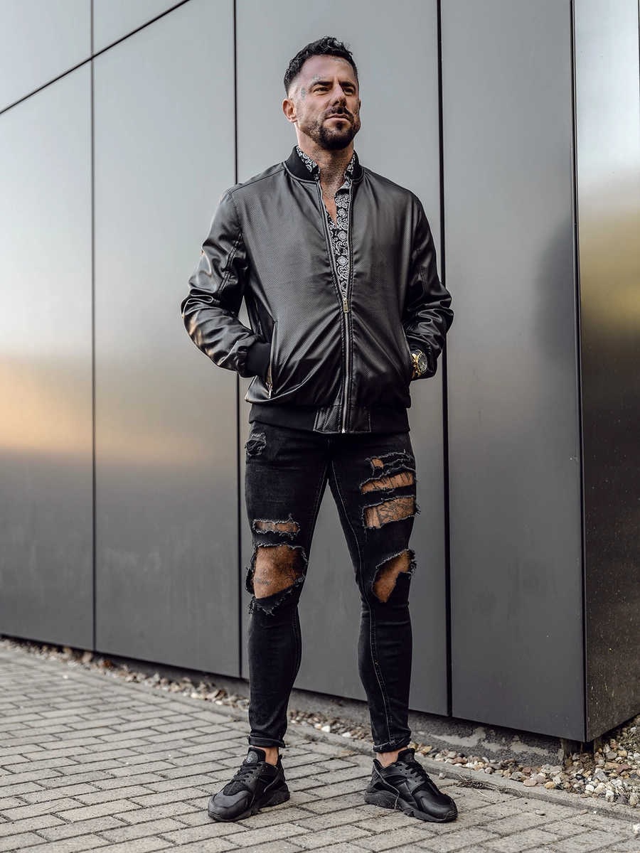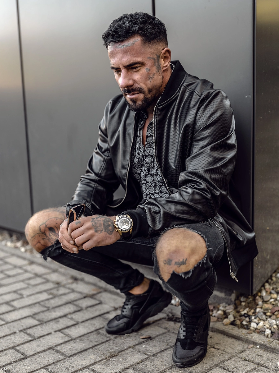 Iögonfallande svart herrskinnjacka 7110A2 från Bolfs kollektion. Den stängs med en dragkedja och har ståkrage med mudd. Två utvändiga fickor med dragkedjor och en innerficka ger den en praktisk karaktär. Nertill och vid ärmsluten finns en ribbning för att hålla vind och kyla ute. Skinnjackan har ett universellt snitt så den passar bra med många olika stilar och tillfällen. Den är tillverkad av två material, ekologiskt läder. Den passar bra med joggers, jeans eller lite mer ledigt, till sweatpants.