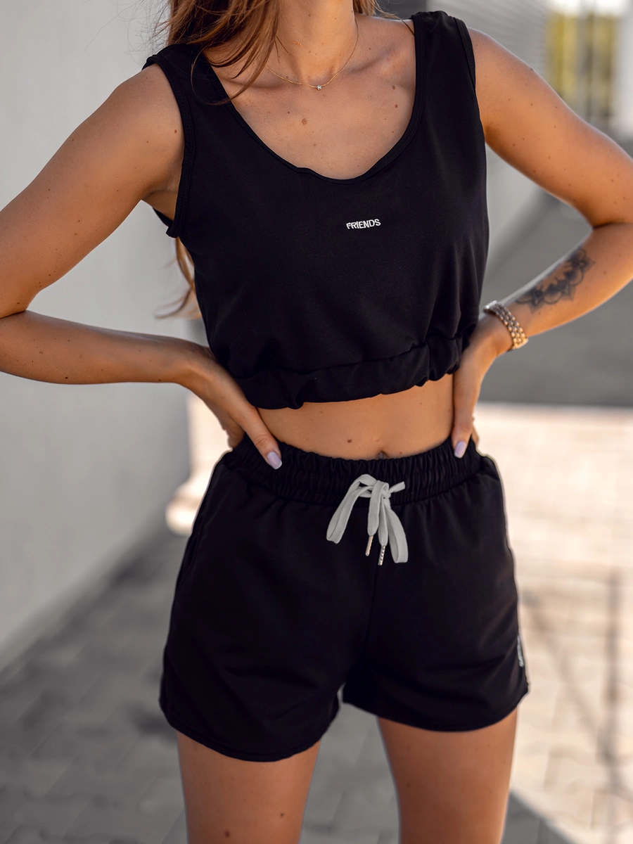 Fantastisk svart 2-delad sportoutfit för kvinnor YP1003A från Bolf-kollektionen. Setet består av en top och shorts. Shortsen är reglerbara i midjan med en kraftig resår och dragsko. Ett enkelt snitt med bra passform ger dem ett sportigt utseende. Dekorativ skrift på benen ger dem en unik karaktär. Topen har moderiktig text och en mudd nertill. Materialet är av högsta kvalitet. De kan vara en användbar bas för en vardaglig eller sportig outfit. Både tröjan och byxorna kan kombineras med olika kläder, vilket gör dem väldigt användbara för att skapa snygga outfits. De passar perfekt med en sweatshirt eller en väst.