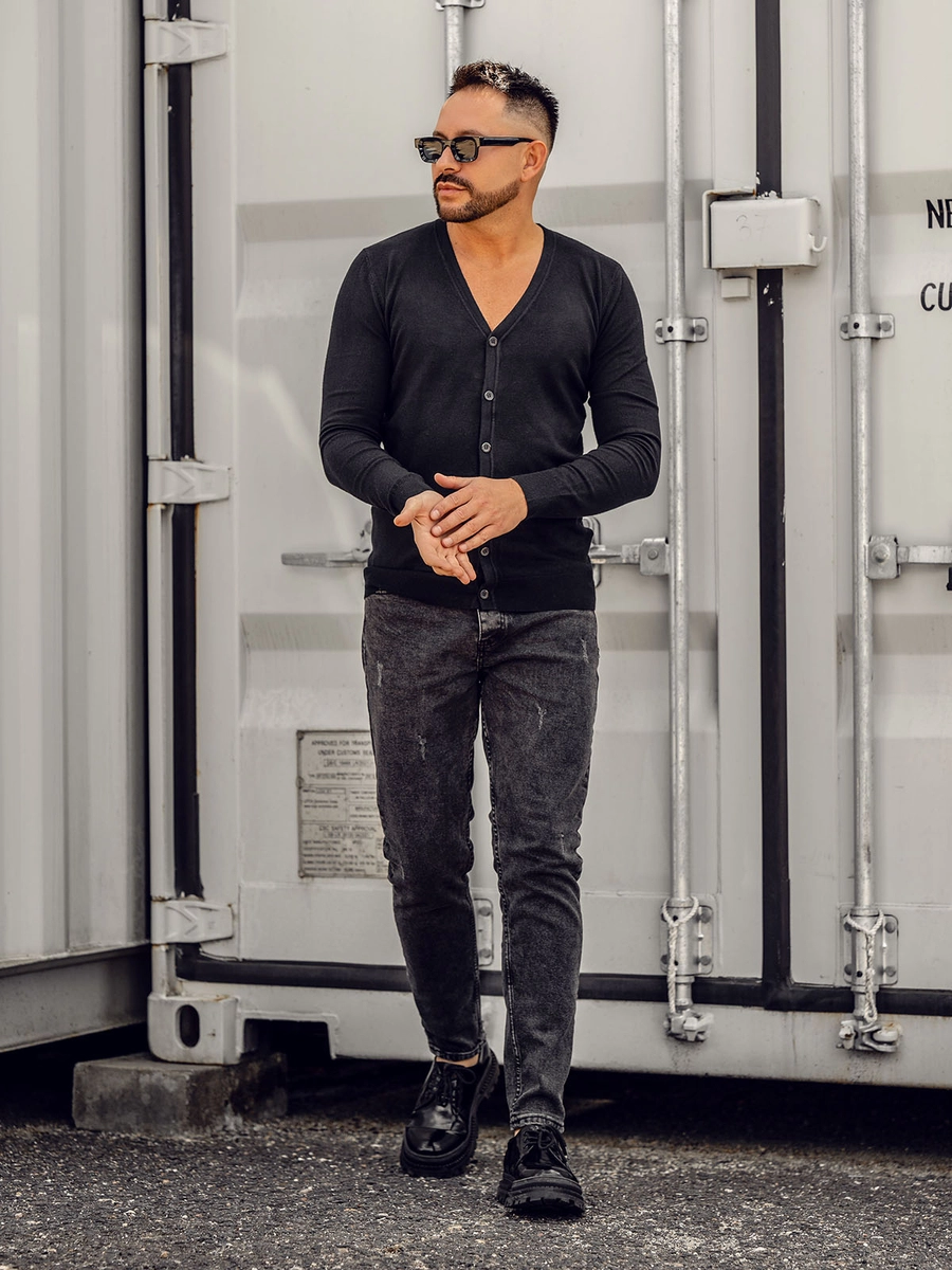 Universal svart herrtröja med dragkedja YY06A från Bolf-kollektionen. Den stängs med knappar och det finns bälte nertill och på ärmarna. Tack vare produktens flexibilitet passar den alla kroppstyper. Den är menad till en vardaglig stil. Perfekt för en promenad, en träff med kompisarna eller för en shoppingtur. Den är tillverkad av 32% akryl, 27% polyester, 23% nylon och 18% viskos. Den passar bra med jeans eller bomullsbyxor.