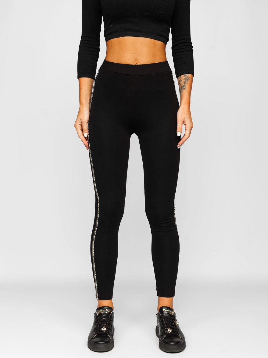 Klassiska svarta slim fit damleggings W6997A2 från Bolfs kollektion. Ett enkelt snitt med bra passform och resår i midjan ger dem ett sportigt utseende. Dekorativa band med tryck på sidorna och i midjan. De är tillverkade av ett väldigt fint och mjukt material av högsta kvalitet. Ett par leggings kan vara en perfekt bas för en vardalig eller sportig outfit. De fungerar även utmärkt under ett krävande träningspass eller på löp- eller cykelturen. Kombinera med en lång cardigan eller en kappa för den perfekta stilen när du träffar dina vänner.