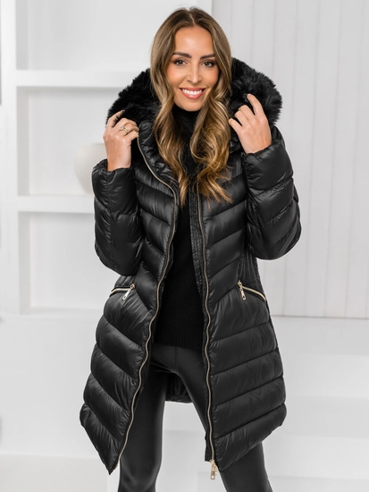 Feedback från kunder Dam Lång Vinterquiltad jacka med huva Svart Bolf 5M3162A2