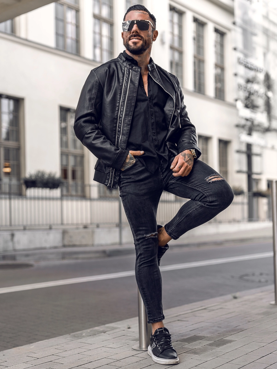 Snygg svart herr skinnjacka 1073 från Bolfs kollektion. En funktionell dubbel dragkedjestängning. Dekorativa sömmar på axlar, sidor och ärmar. Det finns en stå upp krage med kardborre.. Två utvändiga fickor med dragkedja samt en inneficka. Ärmarna kan regleras med snäppen. Denna modell passar lika bra till vardagslivet som träningspasset. Lättviktsjacka som passar bra tillsammans med någon tröja under. Använd gärna med jeans, chinos eller joggers, en huvtröja, en skjorta eller en polotröja.